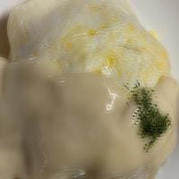 - 7 器に5を盛り付けて形を整えます。卵黄を中心にのせ、3を被せてラップで形を整えます。6をかけ、イタリアンパセリを添えて完成です。