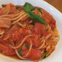 定番のトマトバジルのスパゲティです。カットトマト缶にフレッシュなトマトも加えてさっぱりとしたソースに仕上げました。トマトソースは食パンに塗ってチーズを乗せて焼けばピザトーストにもなります。どうぞお試しください。