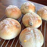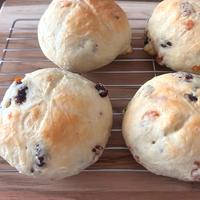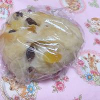 ドライフルーツを白ワインに漬けて焼きました。表面カリッと、中シットリモチモチで甘酸っぱく美味しかったです😺熱々をマーガリン乗せて食べるとまた最高でした(^^)。