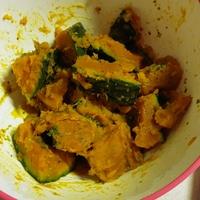 - 1 かぼちゃは皮付きのまま一口大に切ります。