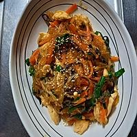 フライパンに醤油酒みりん各大さじ1.5 砂糖大さじ1弱 鶏がらスープの素小さじ1弱、片栗粉小さじ1\2を混ぜながら弱火で煮立てる。春雨加えて弱めの中火でタレを吸わせて水分飛んだら野菜とささみを戻し入れ、絡めるように炒める。最後にごま油小さじ2を回し入れる。