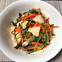 鶏胸肉で春雨は乾燥50g、ラー油は少なめにして作りました。春雨がピリ辛ツルツルで美味しかったです。