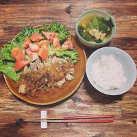 豚ロースが無く鶏もも肉で、キャベツをサニーレタスに変更、余っていた煮卵を乗せてアレンジしました!