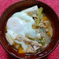 - 5 弱火にしてみそを溶き入れたら卵を入れ、卵白が固まってきたら3を戻し入れて火から下ろします。