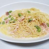 今日は太麺を使ってみました。クリームソースとよく絡み美味しく仕上がりました。バターで炒めたカリカリベーコンがよく合いますね。