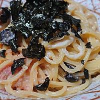 ブラックオリーブの瓶詰めを消費すべく。ソースは1人前にパスタ120g、たらこが足りなかったので火を止めてから混ぜ、かいわれの代わりにもみ海苔を。
