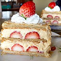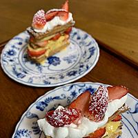 - 7 2を8枚並べ、5の1/3量を乗せ、薄切りにしたいちごを乗せ、パイ生地を8枚重ねます。更に5といちごを乗せます。残りのパイ生地を乗せ、残りの5とみじん切りのいちごを飾ります。粉糖を振ってミントを乗せたら完成です。