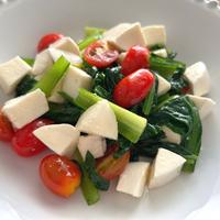 小松菜の緑と、トマトの赤、モッツァレラチーズの白のコントラストが綺麗