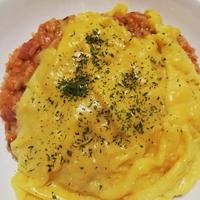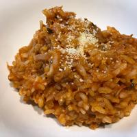 トマトリゾットにオムレツを乗せててオムリゾットを作りました。 ご飯を利用して簡単なトマトリゾットを作り、上には半熟状のオムレツを乗っけると見た目は豪華なのに、意外と素早くパパッと作れてしまうのでおススメですよ。調味料は少ないですが、トマトソース缶を使っているので味はしっかり付いていて、食べ応えのある一品です。是非作ってみてください。