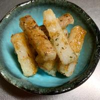 醤油ではなく塩と青のりで。片栗粉ではなく小麦粉を袋に入れて振った。旦那はポテトだと思ったみたいで、騙されてた笑ポテトの方が好きみたいだけど、私はこっちも好き!