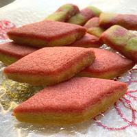 ひな祭りカラーの菱形のクッキーはいかがでしょうか。 卵を使わず作れ、お子様でも簡単に作れる可愛らしいクッキーです。 菱形以外に、お好みの型で型抜きしても、とても可愛く楽しく作れますので、ぜひお試しくださいね。
