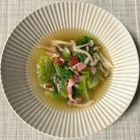 - 5 水、(A)を入れて沸かし、弱火で5分程しめじがしんなりするまで煮たら1を入れひと煮立ちさせ火から下ろします。