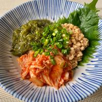 - 2 1をお皿に盛り付けたら、キムチ、納豆、めかぶを盛ります。