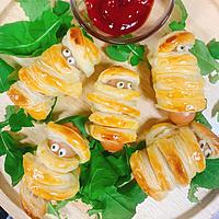 パイ生地がサクサク、ウインナーの皮はパリパリの絶妙な食感が楽しめる一品です。冷凍パイシートを使うので、お子様と一緒に手軽に作れます。目は海苔やチーズをストローで型抜きして作るのがポイント。卵液を塗らずに焼くと、より本物のミイラのような白い仕上がりになります。ホットドッグに挟んでもおいしく、パーティーメニューとしても大活躍。子供たちにも大好評の簡単レシピです。