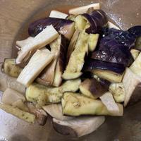 - 1 ナスはヘタを切り落とし、縦半分に切ります。皮目に斜め5mm幅に切り込みを入れてさらに半分に切ってから長さを半分に切り、5分ほど水にさらします。