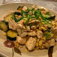 - 4 3にズッキーニとコーンを加えて、ズッキーニに焼き色が付いたら2を加えて手早く全体を混ぜます。