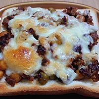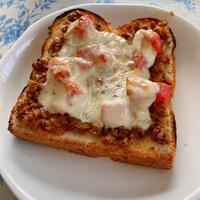- 5 食パンの上に、4とピザ用チーズをのせ、アルミホイルを敷いた天板にのせ、オーブントースターで3分ほど焼き色がつくまで焼きます。