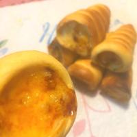 カスタードが思いのほか固いのと少なかったので生クリームと混ぜて作ったところ逆にゆるゆるになってしまって横に置いた時に中身がこぼれそうだったので急遽グラニュー糖を上に撒き炙ってクリームブリュレにしました!