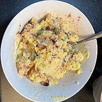 - 1 じゃがいもは一口大に切り、耐熱ボウルに入れてラップをし、600Wの電子レンジで柔らかくなるまで5分程度加熱します。軽く水気を取り、熱いうちに潰して粗熱を取っておきます。