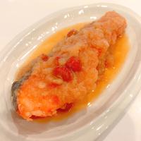 - 2 鮭は3等分に切り、片栗粉を全体にまぶします。