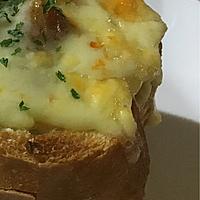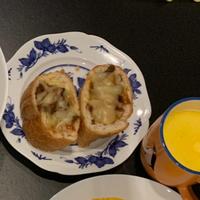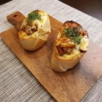 お使いのトースター機種によって焼き加減が異なりますので、様子を見ながらご調整ください。今回は1000W220℃で焼いています。牛肉はお好きな部位でお作りいただけます。焼いている時にビーフシチューが底から流れ出ないように、フランスパンの内側はしっかり押し込んでください。