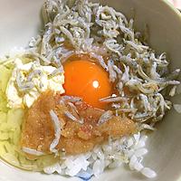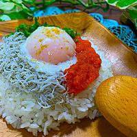 - 4 器にごはんを盛り付け、3、釜揚げしらす、卵黄、2をのせて完成です。