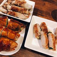 - 2 豚ロースを広げ、大葉、クリームチーズ、明太子を順に乗せてくるくると巻いていきます。