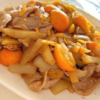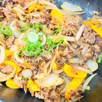 - 6 牛こま切れ肉に火が通ったら、1、(A)を入れて中火で炒めます。
