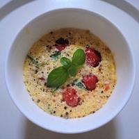 ツナと相性のよいトマトとバジルを卵と組み合わせて、電子レンジ加熱で仕上げる簡単な卵料理です。お好みでチーズを混ぜたり仕上げにかけたりしても、美味しく食べられますよ。忙しい朝やもうひと品欲しい時に、ぜひお試しください。
