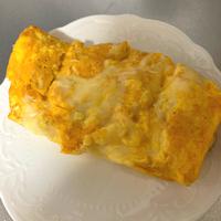 - 3 残りの1を1/3量流し入れ、スライスチーズをのせ、巻きます。