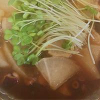 - 3 鍋に水、(A)を入れ混ぜます。中火にかけ沸騰したら1、2を加え混ぜ、落し蓋をし、大根がやわらかくなるまで15分程煮て、火から下ろします。