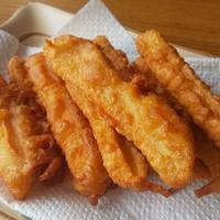 - 3 フライパンの底から3cm程揚げ油を注ぎ180℃に熱し、2を入れて5分程揚げ、両面カリッときつね色になったら油切りをします。