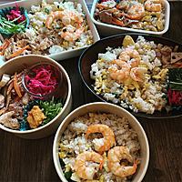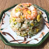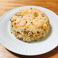 ご飯と溶き卵を混ぜるて炒めるとパラパラになるので、卵を先にご飯と混ぜて、その後、フライパンで炒めて、エビなどの具を入れて、味をつけて、形を整えて食べました!
