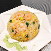 - 3 ごはんと溶き卵が炒め合わさったら1、エビを加えて中火で3分程炒め合わせます。