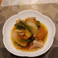 絹さやをいんげんにして、結びしらたき・じゃがいもを追加しました。豚バラを野菜と一緒に炒めようか迷いましたが、レシピ通りに作りました。かぼちゃの甘味と豚バラの旨味が野菜にしみて美味しかったです。