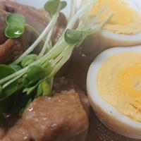 - 3 両面の色が変わったらゆで卵と煮汁の材料、生姜を入れます。落し蓋をして弱火で20分程煮ます。