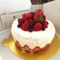 - 13 7が固まったらセルクルから外して表面にホイップクリームを塗りいちご、ブルーベリーを飾って完成です。