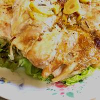 - 9 お皿にサニーレタスを敷き、8を盛り付け、くし切りにした1とお好みで5のニンニクを盛り付けて完成です。