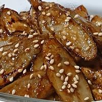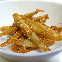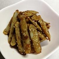 バターのコクと醤油の風味が絶妙に調和した一品です。片栗粉をまぶして炒めることで、ごぼうの食感と旨みを閉じ込め、ジュワッと香ばしさが広がります。作り方も材料も少なくシンプルなのに、お弁当のおかずやお酒のつまみにぴったり。おやつ感覚で食べられるほど止まらない美味しさで、ごぼう嫌いな方も思わずバクバク食べてしまうほど。仕上げにすり潰したいりごまをプラスすると、さらに風味アップです。