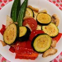 茄子1・黄ズッキーニ1・オクラ3・ピーマン2・ミニトマト使用、料理酒代用。チューブにんにく使ったからか小1の塩が少ししょっぱい。チューブを使う時は塩を調整するべきだったな。味はシンプルだけど美味しく彩りがいい✏️
