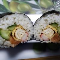 少し早めの恵方巻き。海鮮たっぷり!ではなかったけど、(笑)サーモン、カニカマ、きゅうり、卵焼き(卵焼きフライパンの長い部分で細長く作るの成功!)しそで作りました♪しそは絶対入れたほうが美味しい♡今回は寿司酢を使って、巻きすなしで、ラップで代用。ご飯も海苔一面に乗せると巻いたときはみ出しやすいので、2/3くらいにしておくとお上品にまけることが判明!また来年、忘れないようにします(笑)2020.2.1