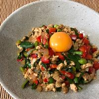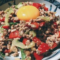 冷蔵庫の野菜を何でも合わせられるタレが魅力的なレシピです。鶏ひき肉とパプリカ、にんじん、玉ねぎなどの彩り野菜を使い、はちみつやバルサミコ酢などで和洋中折衷な味わいに。ごま油の香ばしい風味とトロッとした卵黄が絶妙にマッチし、ご飯との相性も抜群です。野菜を細かく刻めばお子様も食べやすく、調理も簡単なので忙しい日のメインおかずにぴったりです。