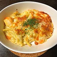 むき海老150g、玉ねぎ1個、マッシュルーム1パック、ペンネ70gで作りました。海老を炒める際に白ワイン追加、ホワイトソースは米粉と豆乳を使い野菜だしで味付け。パン粉も振ってから焼きました。