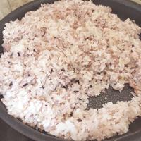 - 1 フライパンに米、水を加え全体が平らになるように混ぜます。