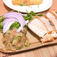 まぐろをレアにする場合は、揚げ油の温度は高めに設定し、表面をサッと揚げてください。 付け合せの野菜は、お好みのものをお使いください。 調味料の加減は、お好みで調整してください。