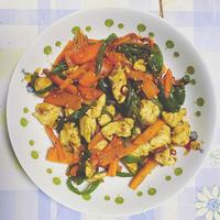 - 4 3に火が通ってきたら、1と調味料を入れて中火で炒め、味が馴染んだら火からおろし、皿に盛り付けて完成です。