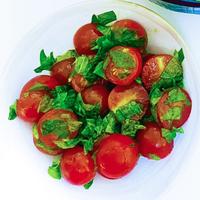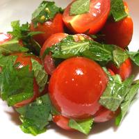 5分で作れる、ミニトマトと大葉のナムルはいかがですか。酸味のあるミニトマトと、香りのよい大葉にナムルの味つけがよく合い、おいしいですよ。ぜひお試しください。