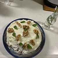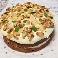 - 8 6を半分に切り、間に7の1/2量を塗って挟みます。上面に7の残りを塗り、くるみとチャービルを飾って完成です。