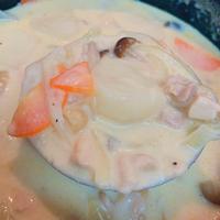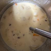 鶏肉に粉しなかったらサラサラミルクスープになったけどおいしい〜!🐮