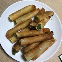 春巻きの皮が高くて、餃子の皮が安かったので繋げて代用。